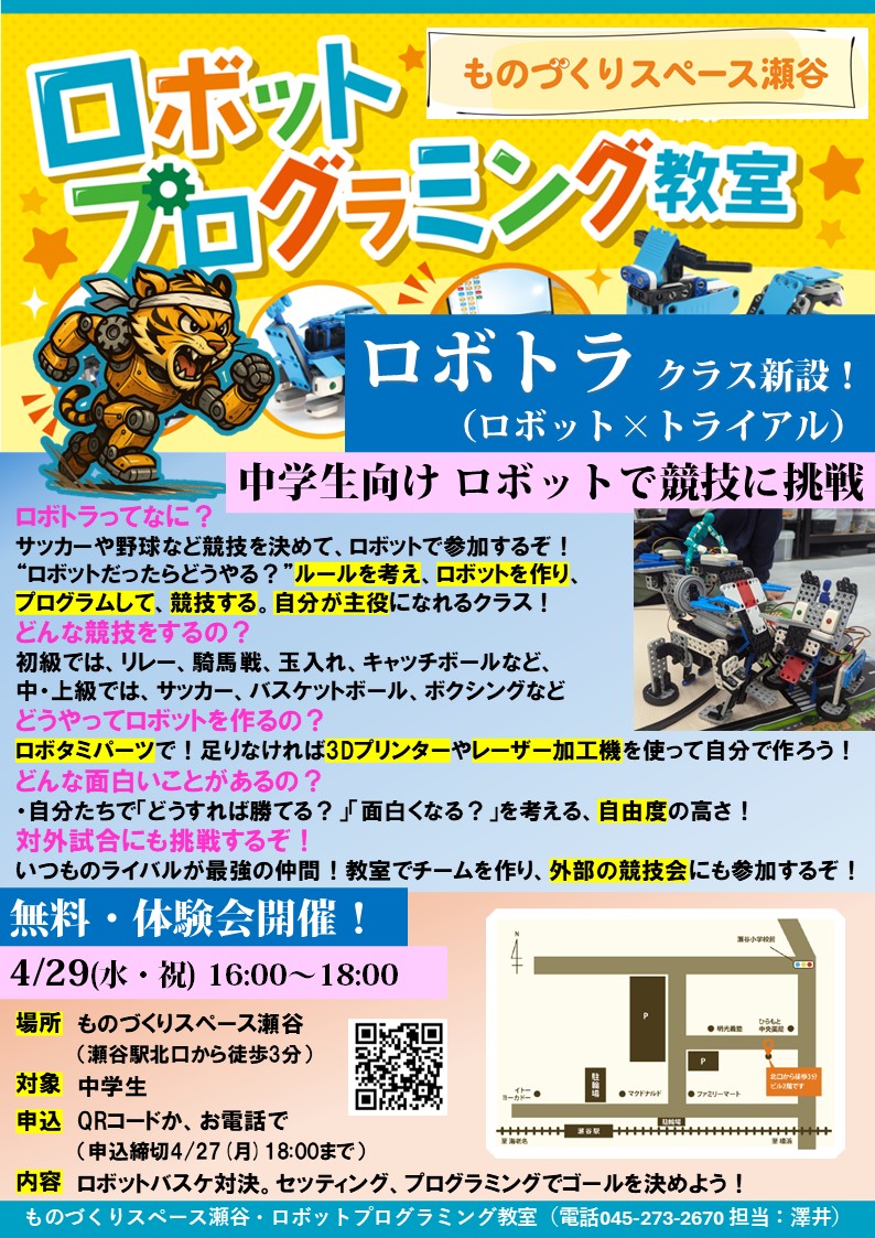 ものづくりスペース瀬谷で開校されている、ロボットプログラミング教室です。全45種類のロボットを毎月1体のペースで組み立て、プログラミングで動かします。