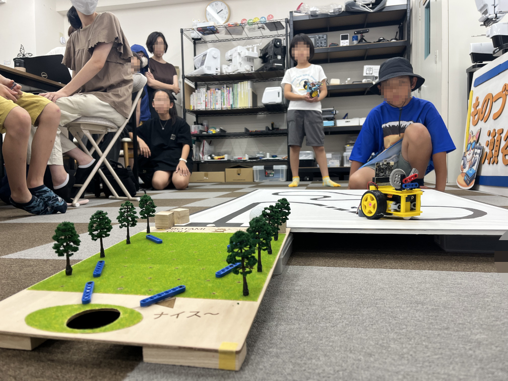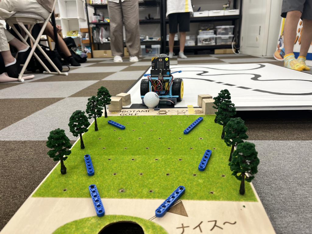 このイベントでは、参加者がロボットを制作し、プログラミングを行い、実際に「ライントレース」と呼ばれるロボット競技に挑戦。ゴルフ場をモチーフにしたユニークなコースを、ロボットが自動走行して進む内容となっており、子どもたちは夢中になって取り組んでくれました。